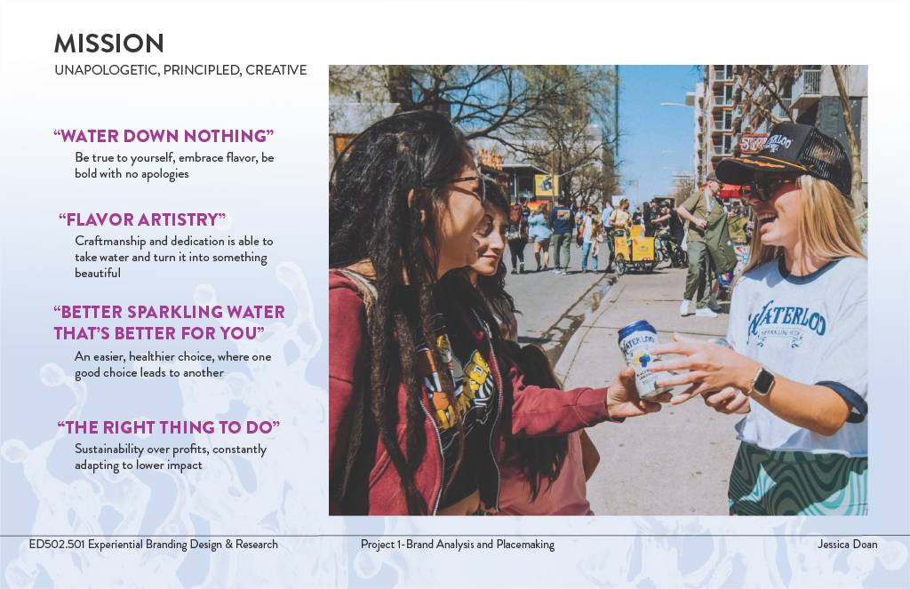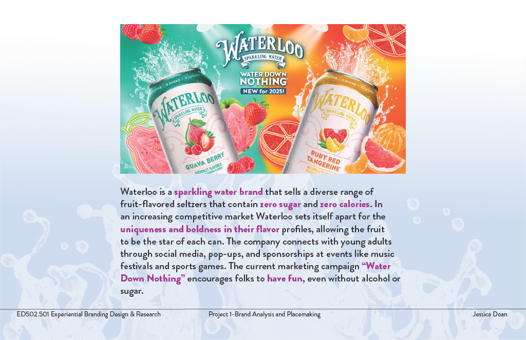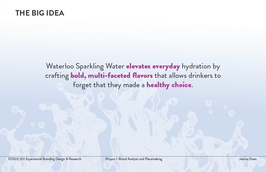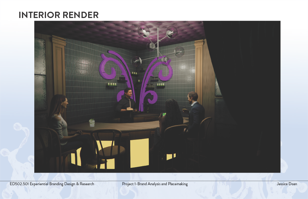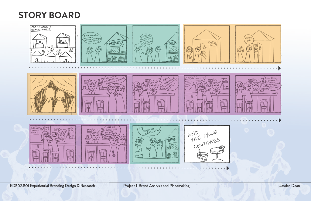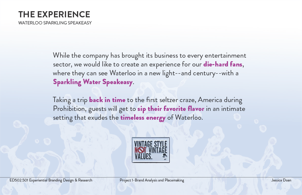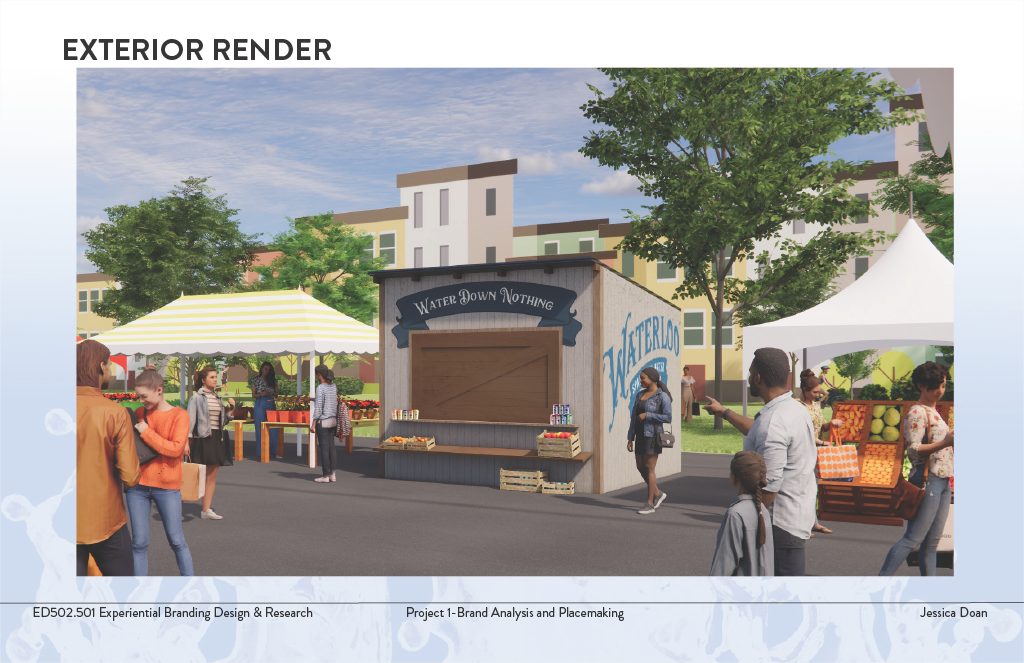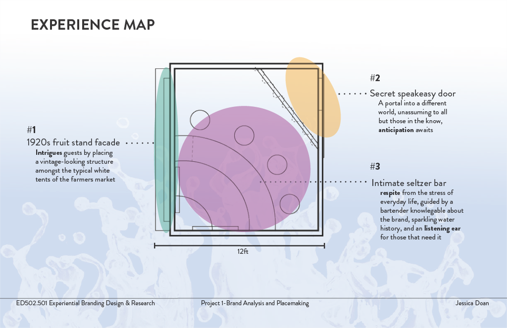 Class project brief asked for an analysis of a brand and a 12'x12' exhibition representing that analysis. Chosen brand is Waterloo Sparkling Water and pop-up concept became a secret seltzer speakeasy hidden in a farmer's market booth.