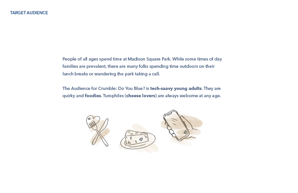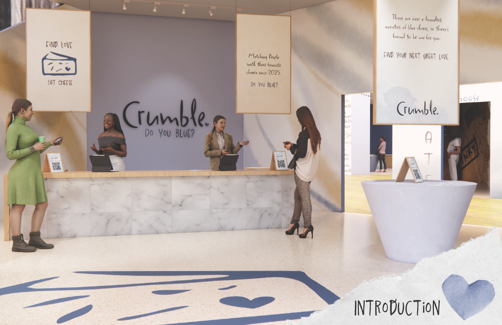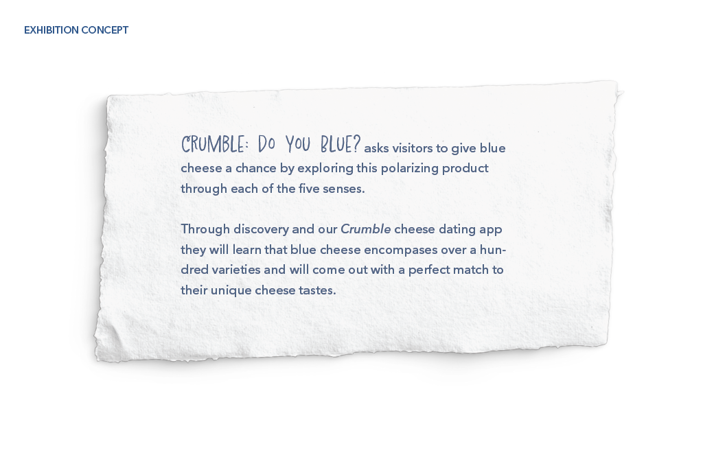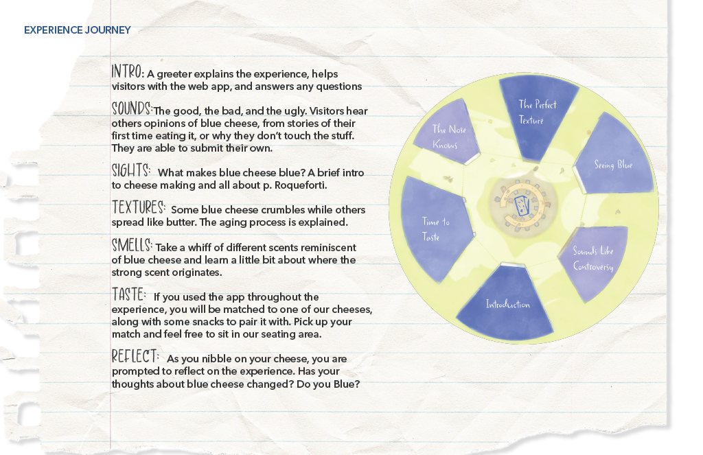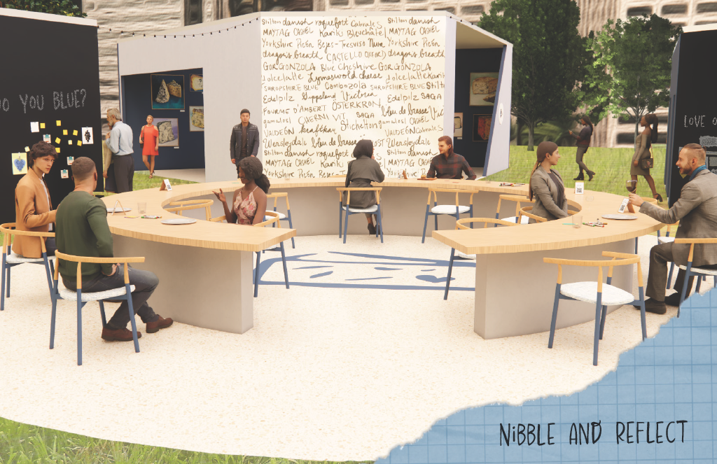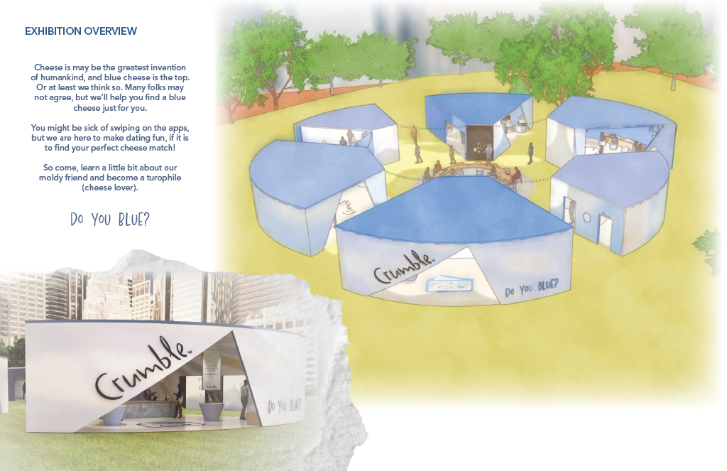Class Project creating a pop-up experience in Madison Square Park New York City, based on a food of choice. Concept is a dating service, complete with app, to help visitors find a blue cheese they might enjoy, while they learn about this polarizing cheese from all five senses.